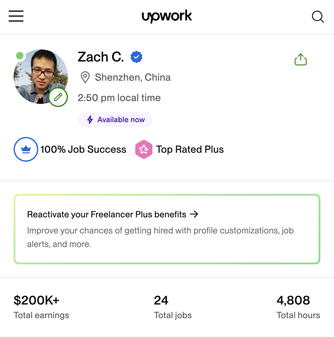 Upwork 5.0★ · $280K+ 总收入 · 238 个付费好评